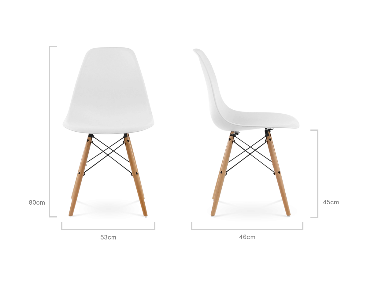 The DSW’s iconic injection moulded ABS seat is mounted onto beech dowel legs with a high grade lacquered steel frame. Faithful to the original design.