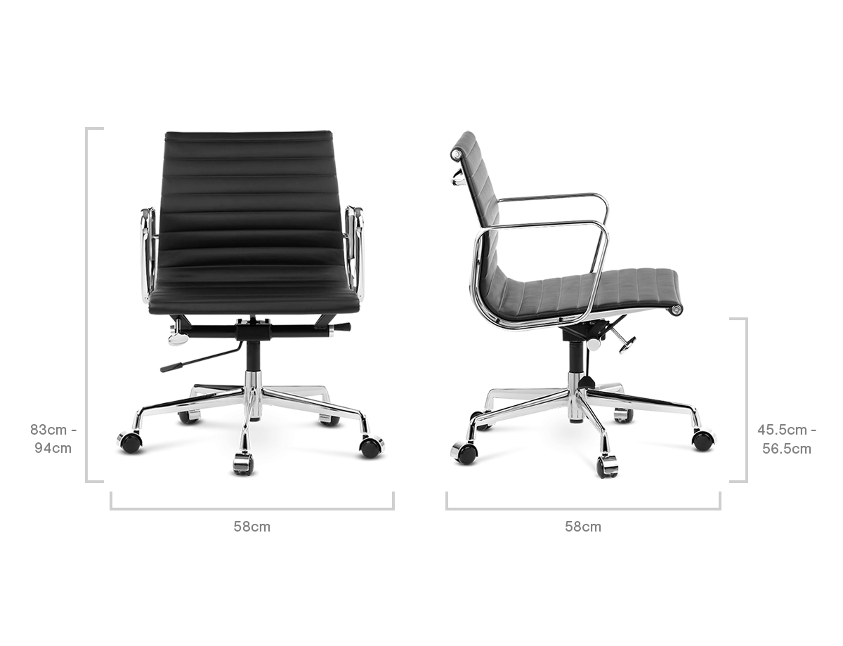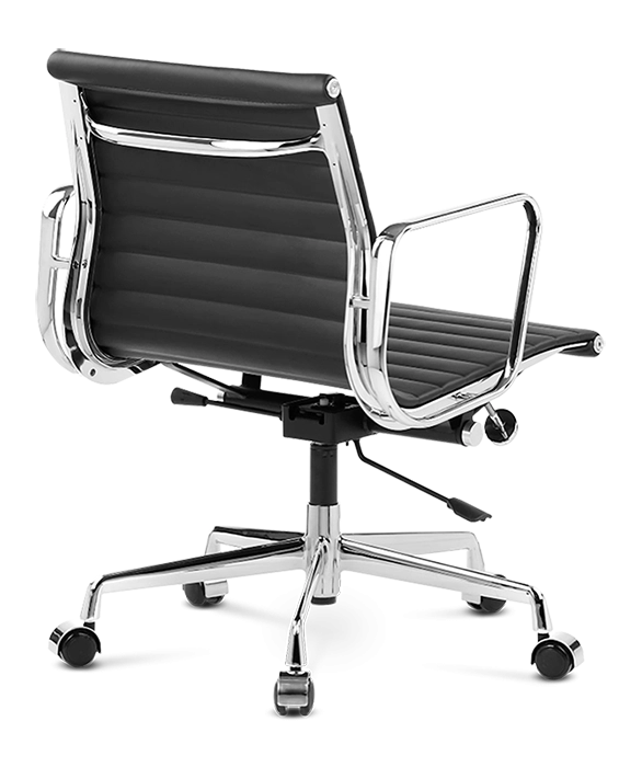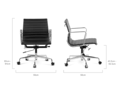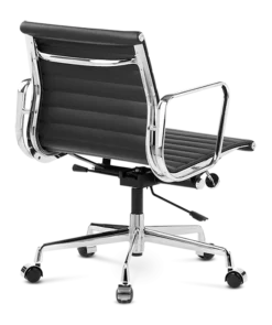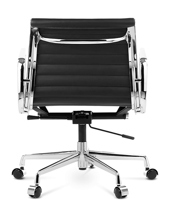Our Eames Management Chair is manufactured to the highest standards with a polished aluminium base on castors – glides available – and finest leather upholstered ribbed padding in a choice of colours. High backed, wool and mesh versions are also available.