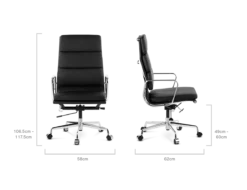 | Product Materials | Chromed aluminium five star base with castors, soft pad cushions upholstered in full grain Italian leather upholstery. Adjustable tilt, height + 360′ swivel. |