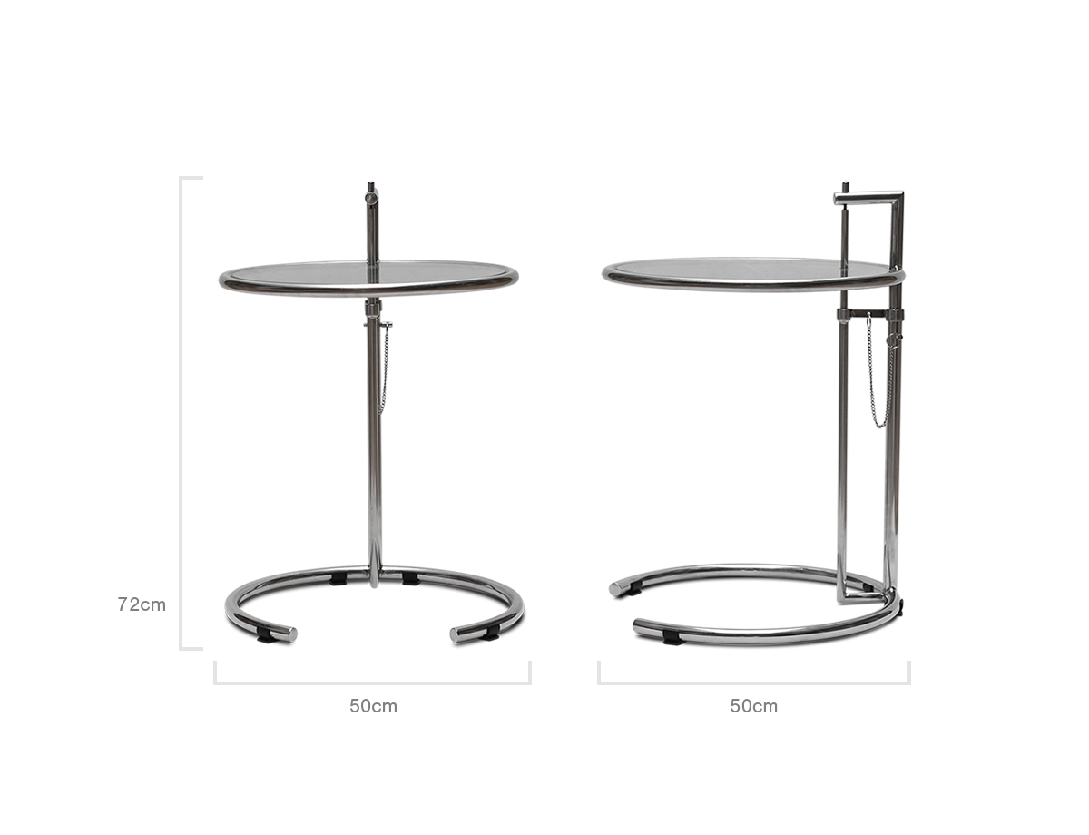 This high quality reproduction Side Table is manufactured in tubular stainless steel with a tempered glass top and is height adjustable