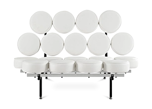 The Marshmallow Sofa, designed in 1956 by George Nelson, can be considered one of the earliest Pop Art furniture designs. Break away from convention and embrace the joy and surprising comfort that comes with a sofa that refuses to be confined by the norms of design. This high quality replica Marshmallow sofa is crafted from a stainless steel frame, black legs and has 18 round marshmallow style seat cushions upholstered in full grain Italian Italian leather.