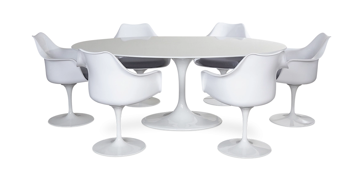The replica table’s unique aluminium central stem allows for ample leg room whilst the table top helps to give your room a modern statement. The Tulip Table and Chairs belong together.