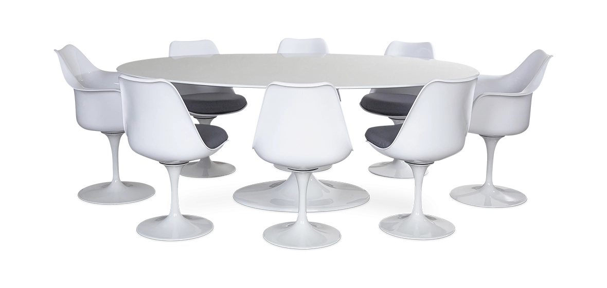 The replica table’s unique aluminium central stem allows for ample leg room whilst the table top helps to give your room a modern statement. The Tulip Table and Chairs belong together.