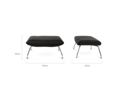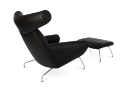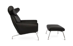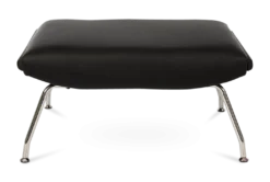 Faithful to Wegner’s original design, the Ox & matching ottoman is upholstered in Italian leather with a tubular stainless steel frame.