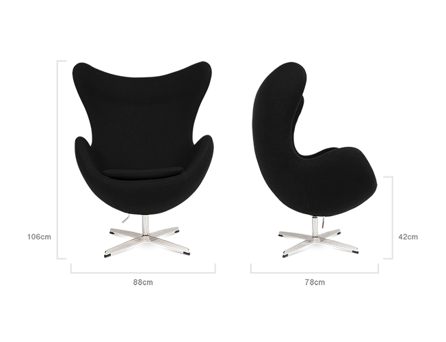 | Product Materials | Moulded fibreglass, upholstered in hand stitched wool, cashmere or full grain Italian leather, 4 star polished stainless steel base with plastic glides. 360° swivel mechanism. |